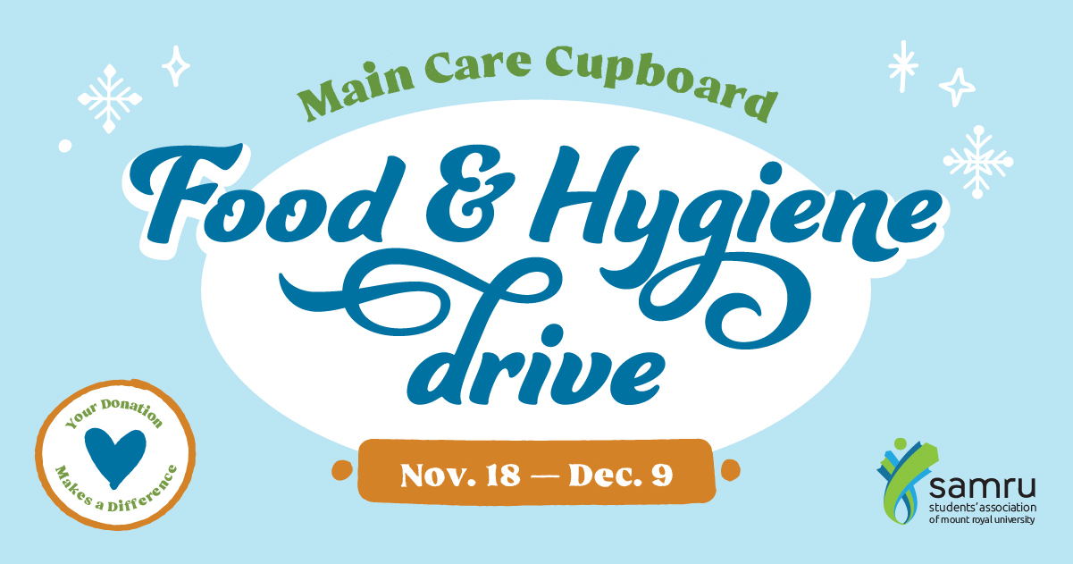 The SAMRU Food and Hygiene Drive aims to supplement the Main Care Cupboard in the Peer Support Centre with donations from the MRU community. These donations will help us to ensure that SAMRU has enough food and hygiene products to meet the growing need for care packages!